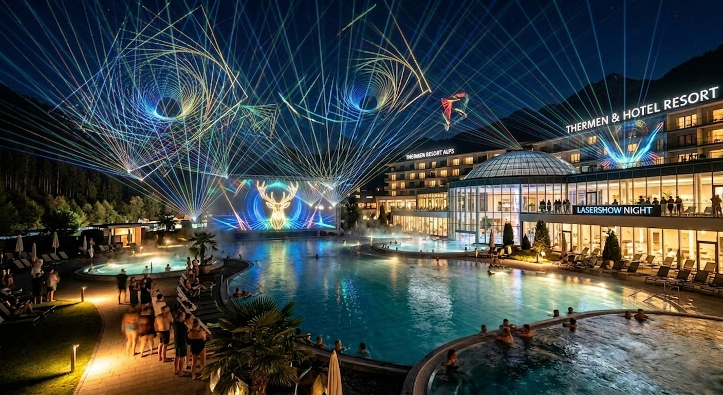 Verwandeln Sie Ihre Pool-Landschaft in eine multidimensionale Bühne.. Unsere Wasser-Lasershows sind ein massiver Besuchermagnet, der die Aufenthaltsdauer Ihrer Gäste verlängert und für enorme Reichweite in den sozialen Medien sorgt.